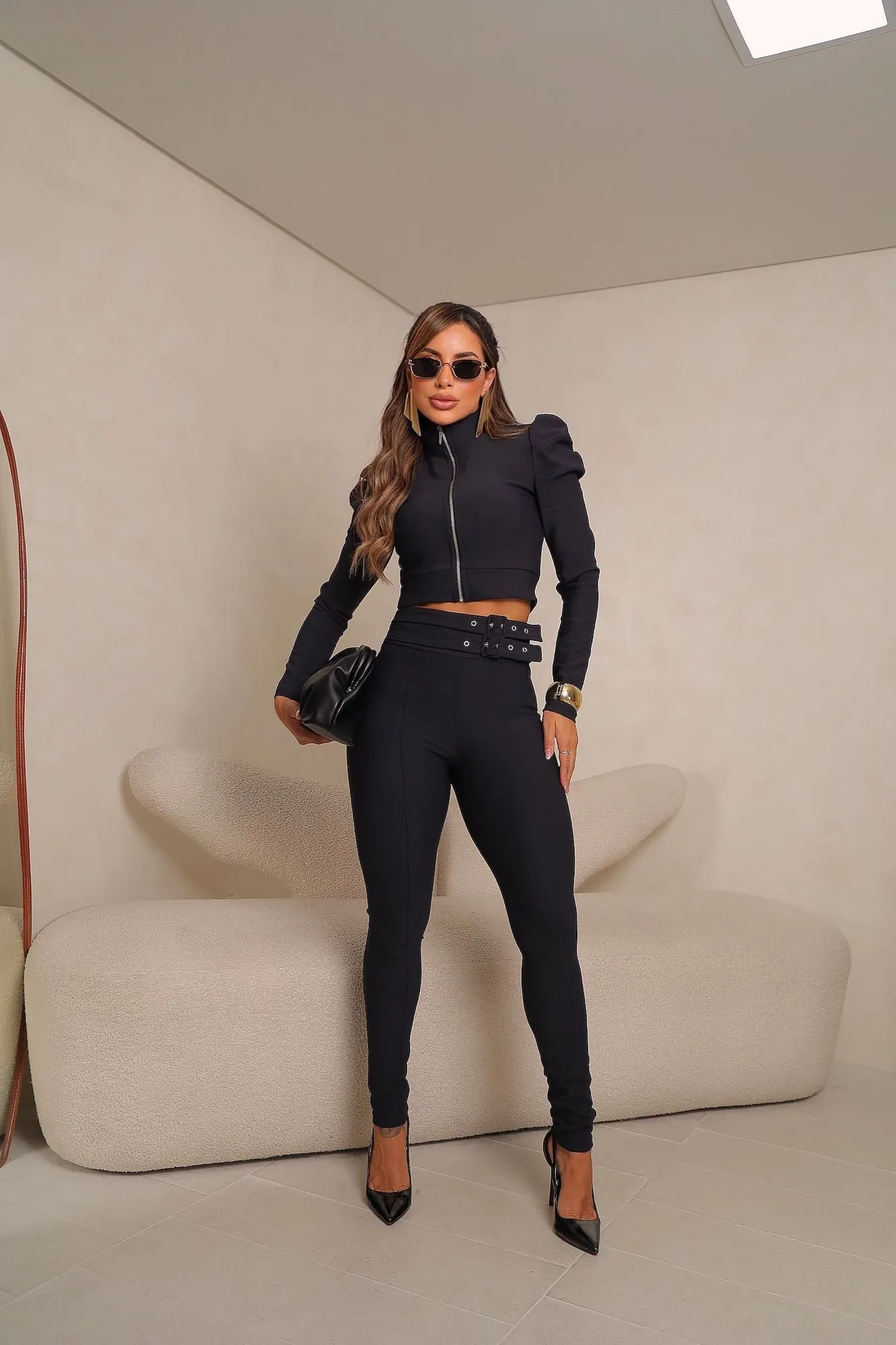 Calça na montaria de poliamida, tecido encorpado e com bastante elastano, possui cinto duplo embutido, recortes e prespontos que dão uma valorizada nas curvas, possui bolso e ziper atras, os ilhós e fivelas podem ser lavados normalmente sem risco de ficar preto ou enferrujar.